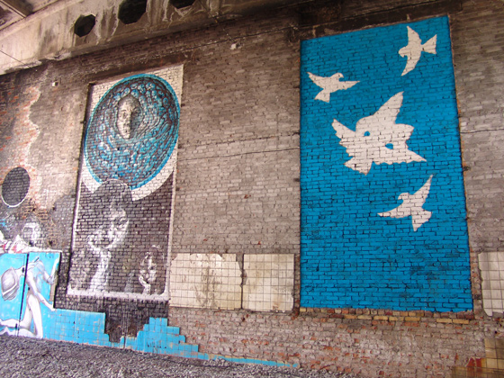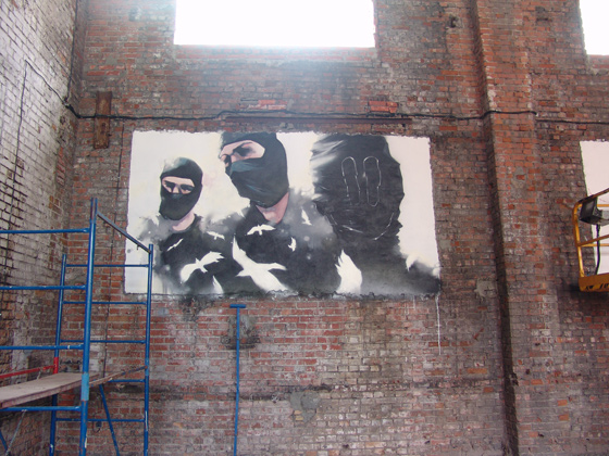 Нистратова: Миша, куратор Музея стрит-арта последние два года, — историк. Я занимаюсь художниками и выбором репрезентации, меня больше интересует искусство. Вова Воротнев, наш киевский куратор, занимается теорией, философскими вопросами и отвечает за украинскую делегацию. Для нас троих это интересная кооперация, потому что Миша эту кашу заварил год назад. Сделать три выставки про Первую мировую — это его идея. Но это очень тяжелая тема для сообщества уличных художников, практически неподъемная в такие краткие сроки: одно только историческое образование требует времени. И я предложила сделать еще одну выставку, где бы мы могли показать украинских и русских художников вместе. Несмотря на соседство и близость, у нас очень разное видение развития стрит-арта, художники просто разные. А потом наши с Мишей темы стремительно слились в одну. И теперь мы стоим здесь, как Джон Леннон, и говорим: Imagine all the people living life in peace.