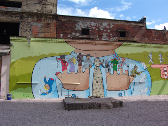Нистратова: Мы постарались нашим выбором авторов репрезентировать то, что сейчас может считаться уличным искусством, монументальным искусством. Мы занимаемся монументальным искусством. Исаак начинал как скульптор, но потом понял, что для его работ улица является лучшей декорацией. Художник из Львова Сергей Радкевич пишет религиозные образы, «Смертный грех. Жадность» — вторая работа из его серии семи грехов, первую он сделал недавно в Польше. Порфирий Федорин учился на иконописца. Дима Ребус — иллюстратор из Москвы. Он никогда в жизни на стенах не рисовал, он работает с акварелью, а мы буквально заставили его рисовать на стене, он очень боялся этого объема.
