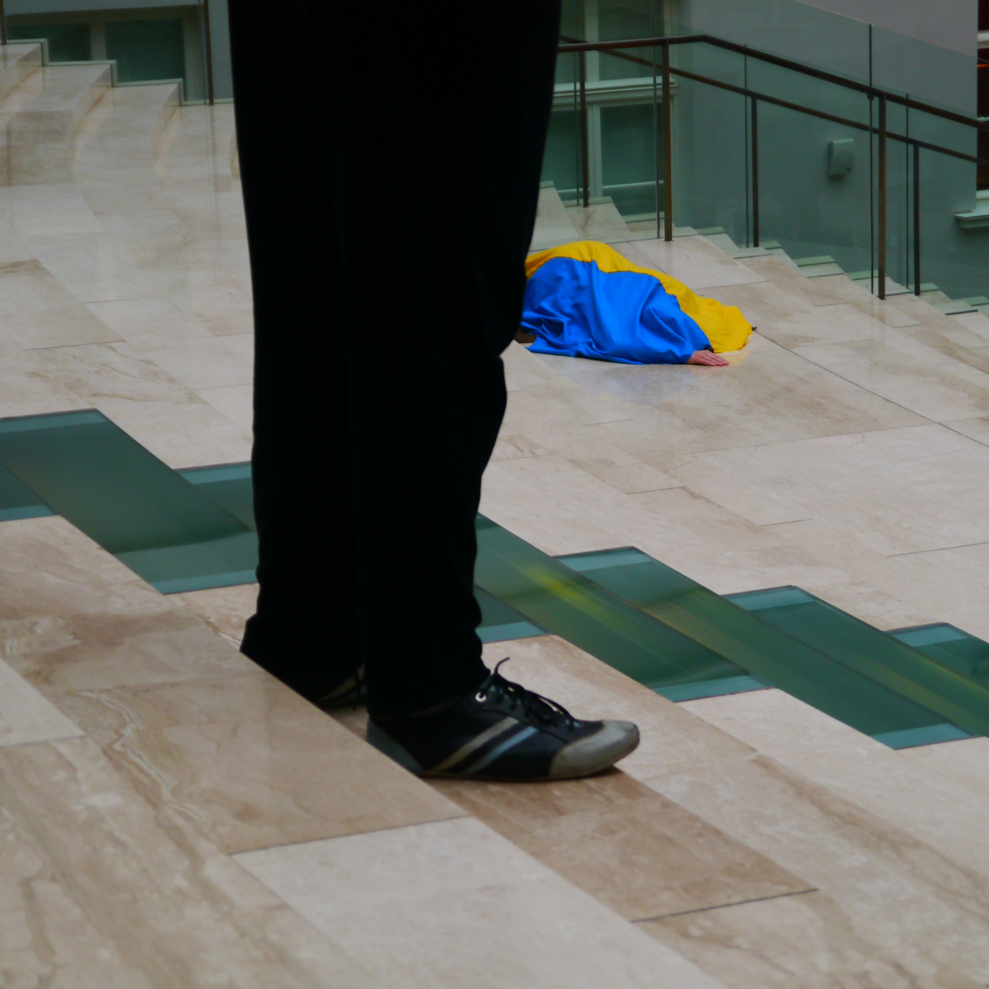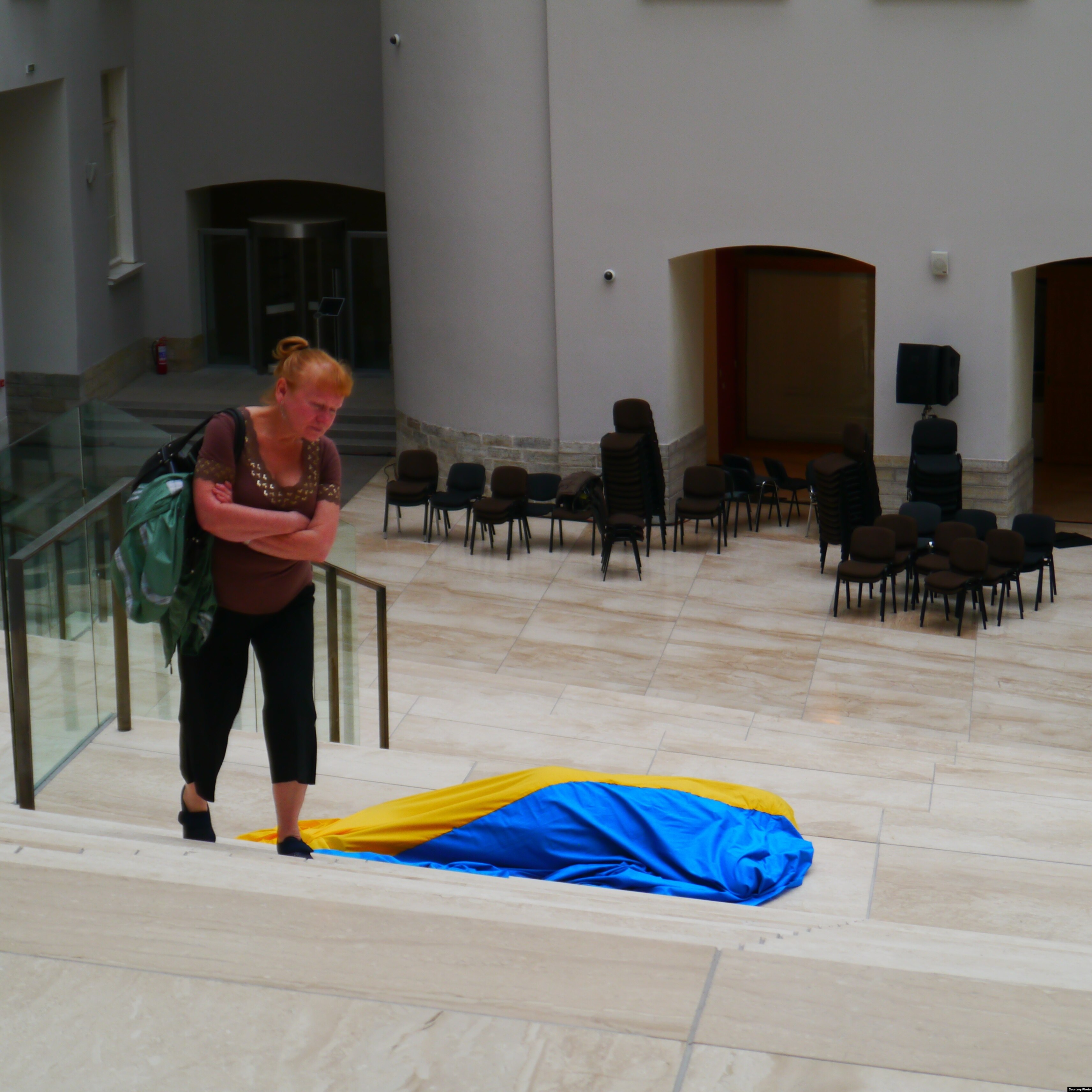 – Как я и предполагала: старались проходить мимо, не замечая. Они боялись. Никто из людей, обсуждавших мою акцию, не говорил, что это флаг Украины. Все говорили: "Это желто-синий!" Это очень показательно. Я не видела этих людей, я их только слышала. Но и людей было немного, на биеннале вообще было мало посетителей. Одна женщина посмотрела, и, как, мне рассказывала моя подруга, сделала возмущенное лицо, типа: "Что ты себе позволяешь!" Один парень подошел и сказал: "Девушка! Можно я на вас лягу, а потом на***?" Ущербная какая-то реакция, черно-белая, примитивная. Это ведь флаг страны, которая сейчас истекает кровью, находится в тяжелом политическом и экономическом положении…