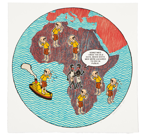 Антон Каннемеер. Слезы на публике. 2011. Courtesy of the Stevenson Gallery, Johannesburg Ну и, конечно же, вопрос о деколонизации. Нам было интересно взглянуть, как сегодня устроен колониальный процесс, как он соотносится с разными формами империализма и как на него влияет глобализация. Но что в особенности нам было интересно в анализе Фанона, так это то, каким образом и в каком обществе процесс преодоления колониального прошлого достигает успеха, устанавливается новая система и новое общество и как в то же время оно сохраняет пережитки предыдущего периода, которые могут привести к реставрации прежних порядков. Это особенно важно для нас, это вопрос ответственности, которую все мы, как культурные работники, разделяем, что мы также обсуждаем с приглашенными художниками.