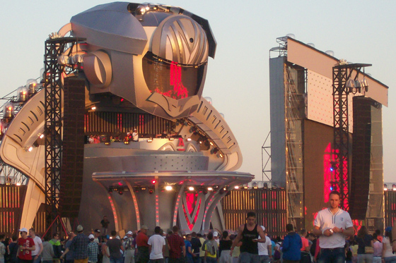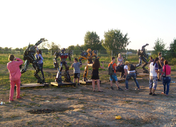 © Наталья Кострова «Роботрон-шоу» — двенадцать трансформеров высотой до 2,5 м Из Нижнего Новгорода до Большого Козина (и обратно) все три дня можно было абсолютно бесплатно доехать на маршрутках. Не на шатлах будущего, а на обычных «пазиках» с характерным запахом солярки. Нижегородцы, быстро пронюхав, что проезд на этих автобусах бесплатный, радостно воспользовались неожиданной халявой (в повседневной жизни двухчасовая поездка в один конец стоит 20 р.). Не исключено, что поэтому водители «пазиков» смены парадигмы не почувствовали и как слушали радио «Шансон», так и продолжали его слушать. Людей, едущих на фестиваль, это даже веселило — и вечером в субботу вся маршрутка, направлявшаяся на праздник будущего и электронной музыки, хором распевала «Дорога к обеду ложка, к ночи дорог унитаз» певца Трофима. Английские туристы, как-то затесавшиеся на тот же рейс и не без основания полагавшие, что английский язык в радиусе нескольких километров никто не понимает, открыто обсуждали гипнотический талант одного из хедлайнеров фестиваля — Skrillex'а. Девушка говорила что-то вроде «Его музыка пробирается в самый мозг». «Ага, — поддакивал молодой человек, — особенно если мозг смазан экстази». Всю дорогу англичане мяли в руках полупустые банки с пивом — никаких других веселящих средств с собой у них вроде не было.
