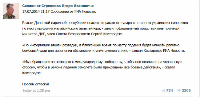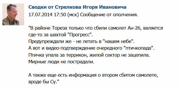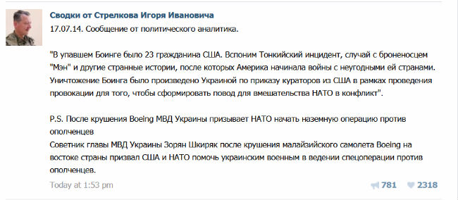 А еще через минуту командующий силами сепаратистов Игорь Стрелков сделал на своей странице "Вконтакте" запись, показывающую, что он осведомлен о том, что сбит самолет, но еще не знает, что это самолет иностранной компании. Стиль записи отличается глумливым спокойствием: