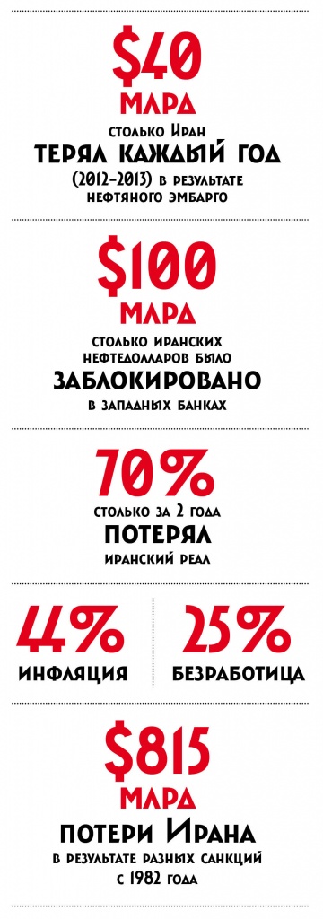 «Стремительное возвращение Ирана на нулевую позицию во избежание дополнительных потерь», — так описывает текущую ситуацию Рена Тагизаде, иранский эксперт по ядерной энергетике. Нулевая позиция, впрочем, вовсе не означает полный отказ от атома. Производство обогащенного до 20% урана исламский режим начал в январе 2012 года, создав за два года около 200 килограммов этого материала. Рена Тагизаде оценил этот запас в $2 млн — такова его стоимость на международном рынке. Впрочем, ядерная программа, стоившая Тегерану самых жестких за всю историю противостояния с Западом санкций, обошлась Ирану гораздо дороже. С 2012 по 2013 год экспорт иранской нефти сократился на миллион баррелей в день, что стоило стране до $40 млрд в год. За тот же период порядка $100 млрд иранских нефтедолларов были заблокированы в западных банках. Санкции против иранской банковской системы, отрезанной от всего остального мира, привели к уменьшению внешней торговли примерно на треть, увеличив стоимость импорта на 30%. Санкции привели к тому, что иранский реал за последний год потерял 70% своей стоимости, экономика вошла в режим стагнации, картину довершили 44% инфляции в годовом выражении и безработица в 25% (все эти цифры даются по примерным оценкам экспертов, поскольку реальные показатели иранской экономики являются государственной тайной).