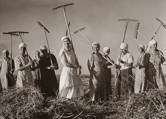Советские крестьянки. Фотография Margaret Bourke-White. 1930-е Помимо демонстрации достижений сельского хозяйства ВСХВ мыслилась в рамках международного выставочного движения, набиравшего обороты с конца XIX века. Создание московской выставки началось еще в 1935 году. Главным художником был назначен один из самых влиятельных авангардистов эпохи, оформитель выставок мирового уровня Л.М. Лисицкий. Для ВСХВ 1935—1937 годов были предложены проекты, которые соответствовали международным образцам модернизма, а в павильонах максимально использовались конструктивные решения национального строительного материала — дерева.