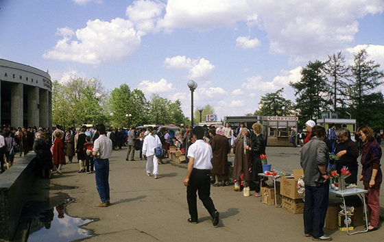 Торговля у станции метро «ВДНХ». 1990-е С начала 1990-х ВВЦ начинает жить новой жизнью — павильоны снимают «челноки», тут организуется бурная и хаотичная торговая деятельность. Экспозиции постепенно растаскиваются, демонтируются, кое-что просто закрывается гипсокартонными перегородками. Помимо торговли всем и вся ВВЦ 1990—2010-х стал пристанищем разнообразных частных музеев — от «Поля чудес» до музея бабочек, динозавров и мамонтов.