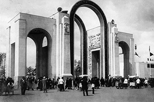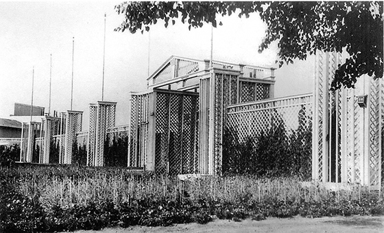 Пергола. 1937 После долгих проволочек и ареста главного архитектора В.К. Олтаржевского, занимавшего эту должность в 1935—1938 годах, вместо первоначально планируемого 1937-го выставка открылась в 1939 году. К тому моменту ярких новаторских решений стало заметно меньше, павильоны взамен конструктивной легкости получили дополнительные неоклассические детали, что соответствовало укрепляющемуся духу социалистического реализма. В таком виде выставка просуществовала до конца войны.