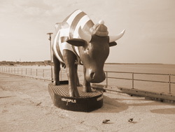 Вентспилс давно удачно вписался в мировой парад коров, который проходил по всему миру – в Нью-Йорке, Лондоне, Гонконге, Сан-Паулу, Стокгольме, Дублине, Брюсселе, Сиднее, Тунисе, Измире… В большинство крупных городов парад приходит и уходит, но для небольшого города на реке Венте, впадающей в Балтийское море, этот парад растянулся на годы. Коровы-статуи здесь разных видов, расцветок и «профессий», появляются в самых разных местах. На пляже, морском вокзале, в детском парке, на набережной у порта, у автовокзала, просто на улицах… Корова-чемодан, корова-моряк, корова - нефтяная труба… Маленькие, большие, гигантские коровы… Первой на автовокзале меня встретила корова-полицейский. Обошлось без проверки документов. Жители Вентспилса, похоже, привыкли смотреть на себя со стороны глазами коров. Это довольно ироничный взгляд.
