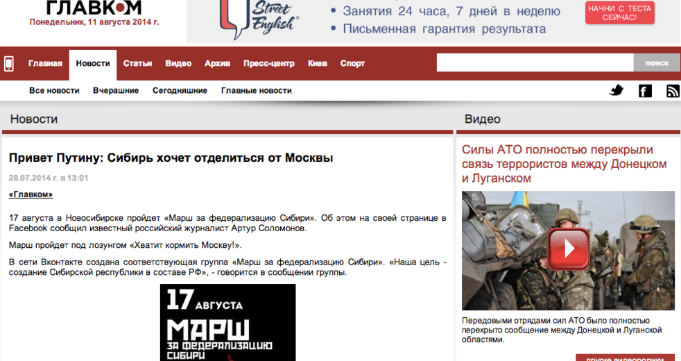Четвертого июля руководство сайта одной из крупнейших в Украине служб новостей ТСН.ua сняло публикацию про марш за федерализацию Сибири по требованию Роскомнадзора, чтобы избежать блокировки сайта на территории России.