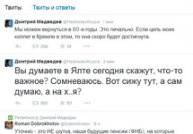 В течение последующего получаса в аккаунте были помещены в частности такие твиты: "Вы думаете, в Ялте сегодня скажут что-то важное? Сомневаюсь. Вот сижу тут, а сам думаю: а на х.я?"; "Российские граждане не должны страдать из-за проблем в восприятии здравого смысла у верховного руководства страны"; "#КрымНеНаш просьба ретвит"; "И все-таки мы подумаем о запрете электричества. Так надежнее".