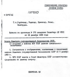 В феврале 1991 года на стол Горбачеву легла аналитическая записка, подготовленная в КГБ, «О политической обстановке в стране». В записке говорилось: «Анализ сложившейся ситуации требует серьезного критического осмысления того, насколько адекватны сформированные почти шесть лет назад понятия демократизации и гласности их нынешнему практическому воплощению... Учитывая глубину кризиса и вероятность резкого осложнения обстановки, нельзя исключить возможность образования в соответствующий момент временных структур в рамках осуществления чрезвычайных мер».