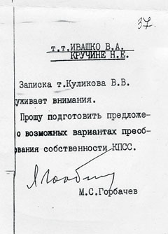 26 августа, на пятый день после провала путчистов, с балкона своей квартиры выбрасывается управляющий делами ЦК КПСС Николай Кручина. На кресле у рабочего стола он оставляет папку с документами, содержащую подробную информацию о коммерческом использовании денежных средств КПСС, организованную специально подготовленными сотрудниками спецслужб как внутри страны, так и за рубежом. Дело по факту самоубийства Кручины выводится в отдельное производство и немедленно засекречивается.