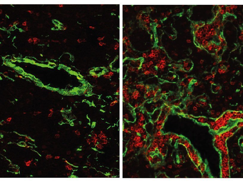 На иллюстрации слева вы видите нормальное состояние тимуса крысы, где очень мало B-лимфоцитов (окрашены красным), а справа - тимус с активированным геном Foxn4 и большим количеством B-лимфоцитов.