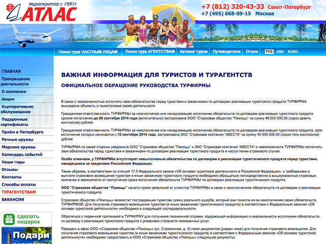 На сайте "Атласа" о каких-либо проблемах в компании ничего не сообщается. На главной странице сайта опубликовано сообщение, в котором рассказывается, что "Атлас" является "надежным туроператором", имеющим возможность предоставить "беспроблемный отдых". Более того, на странице туроператора в Сети имеется возможность оформить путевку.