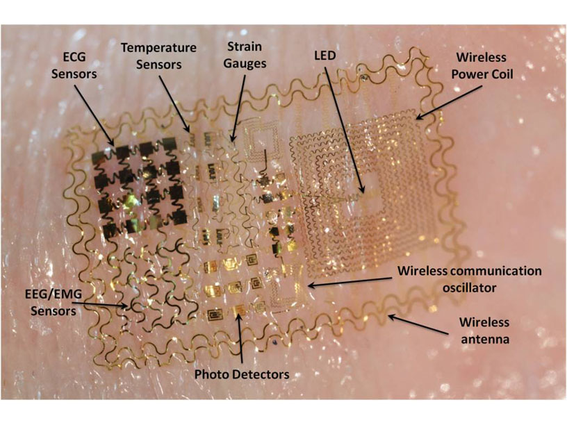 Созданная ими микросхема из кремния и арсенида галлия была предназначена для медицинского мониторинга. Она включала датчики температуры, сенсоры, определяющие электрическую активность нейронов, а также радиоустройство для обратной связи и даже маленькую солнечную батарею. Вся эта «начинка» размещалась между двумя слоями полиимида – тонкого полимера, который уже давно используется для изготовления гибких печатных плат. Удерживалась вся конструкция на коже человека благодаря ван-дер-ваальсовым силам.