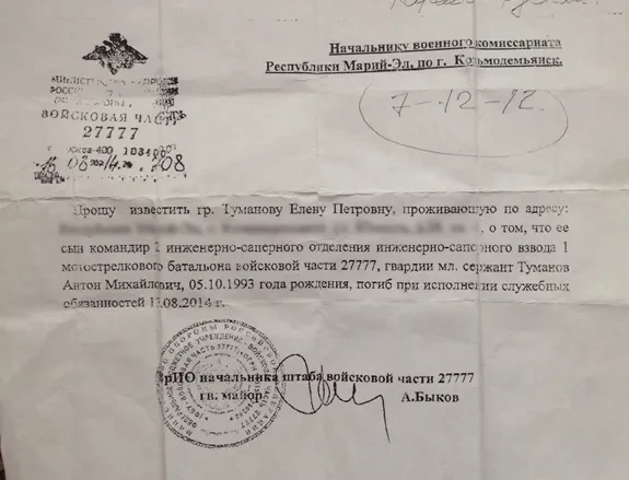Вещи, паспорт и военный билет младшего сержанта Антона Туманова матери еще не отдали. 20 августа Елена Петровна получила только гроб и копию свидетельства о смерти из ростовского морга. Там указана дата смерти — 13 августа 2014 года, место — «Пункт временной дислокации войсковой части 27777», время — «Во время исполнения обязанностей военной службы», и причина — «Сочетанная травма. Множественные осколочные ранения нижних конечностей с повреждением крупных кровеносных сосудов. Острая массивная кровопотеря».