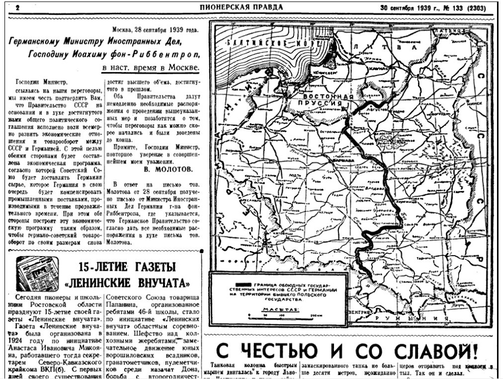 23 сентября «Правда» разместила огромную, на всю полосу карту Польши с нанесенной на ней линией раздела по рекам Писа, Нарев, Висла, Сан — в точном соответствии с секретным протоколом к пакту о ненападении.