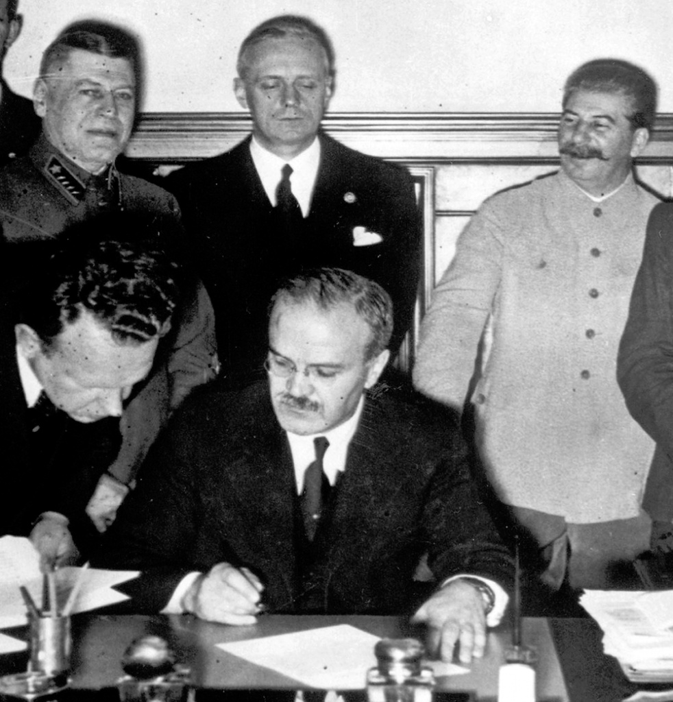 Нарком иностранных дел (и, одновременно, глава правительства) Вячеслав Молотов (сидит) подписывает пакт о ненападении в присутствии товарища Сталина с министром иностранных дел Рейха Иоахимом фон Риббентропом (стоит позади Молотова рядом с маршалом Борисом Шапошниковым). Москва, 23 августа 1939 г.