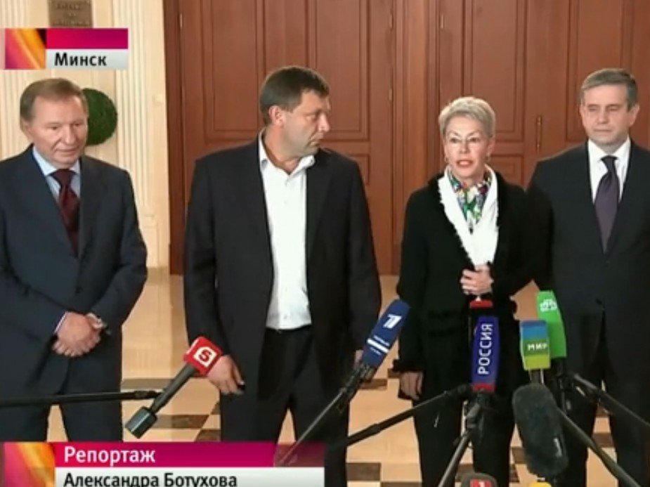 Фрагмент кадра Первого канала В пятницу, 5 сентября, по итогам переговоров контактной группы в Минске было объявлено перемирие. Представители Украины, России и ОБСЕ, а также самопровозглашенных Донецкой и Луганской народных республик подписали протокол «по итогам консультаций Трехсторонней контактной группы относительно совместных шагов, направленных на имплементацию Мирного плана Президента Украины П. Порошенко и инициатив Президента России В. Путина». После подписания Протокола Украина и руководство самопровозглашенных республик заявили о прекращении огня с 18:00 того же дня.