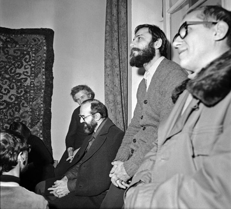 © Георгий Кизевальтер На презентации «Золотого диска» группы «Мухомор». Слева направо: Д. Пригов, И. Кабаков, Э. Булатов, С. Щербаков, О. Васильев. 1982 г. — Я правильно вас понимаю, что национальную культуру нужно сознательно продвигать?