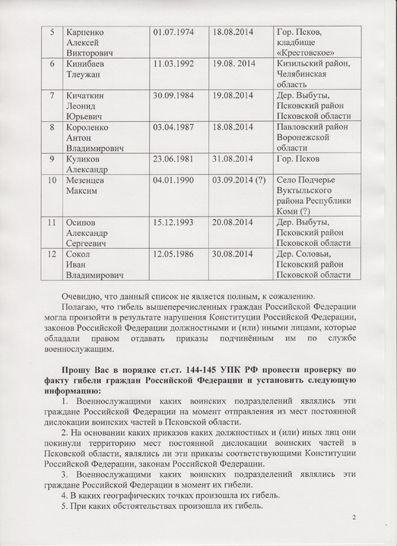 «Прошу Вас провести исчерпывающую проверку всех обстоятельств, связанных с гибелью военнослужащих в указанный период времени, установить должностных и (или) иных лиц, виновных в их гибели, и привлечь их к уголовной ответственности, установленной законодательством РФ», – подытоживает депутат.
