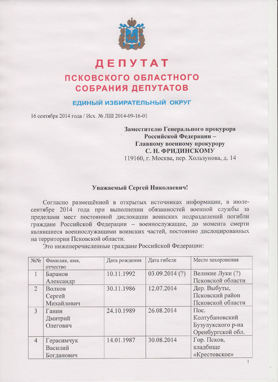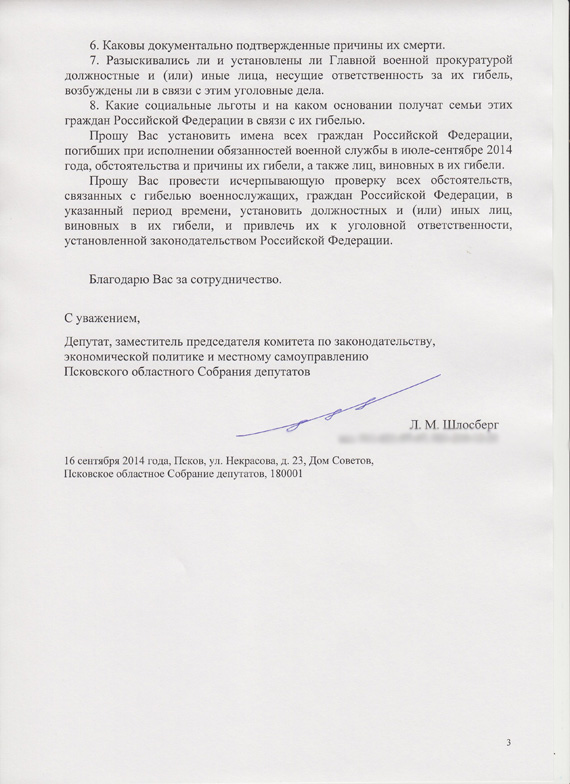 Лев Шлосберг просит Сергея Фридинского установить имена всех военнослужащих, погибших при исполнении своих обязанностей в июле-сентябре 2014 года. А также выяснить: где конкретно служили погибшие десантники? На основании чего покинули место постоянной дислокации? Где и при каких обстоятельствах они погибли? Каковы причины их смерти? Кто несет ответственность, в том числе – уголовную, за гибель бойцов? Получат ли какие-то социальные льготы и на каком основании семьи погибших?