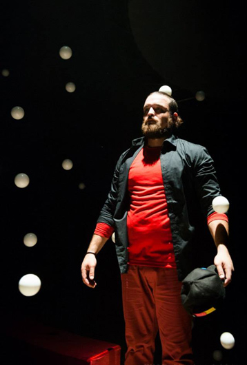 Поскольку присутствовать нужно все равно в каком-то качестве, мы решили, что Моня будет условный чужак, единственный неартист, человек со стороны, разночинец, коверный, немножко клоун, немножко лузер, который днем подметает манеж, а ночью ему снится, что он блестящий жонглер-моноциклист, человек-оркестр — и ему за это музыка, софиты, аплодисменты.