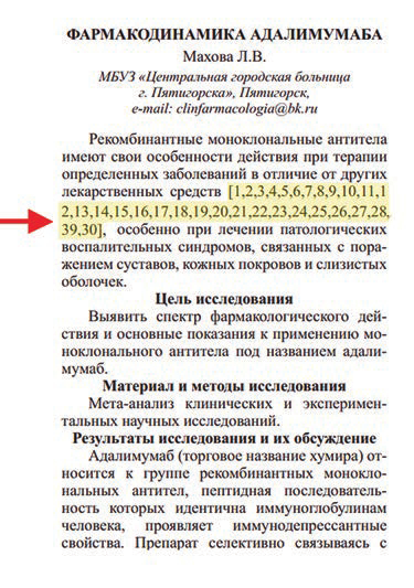 Схема накручивания импакт-фактора несложная — «проверенные» авторы в свои «статьи» объемом в одну-две страницы вставляют, обычно после какой-либо общей фразы во введении, несколько десятков ссылок на журналы «шестерки» (рис. 1) {Приложение D}.