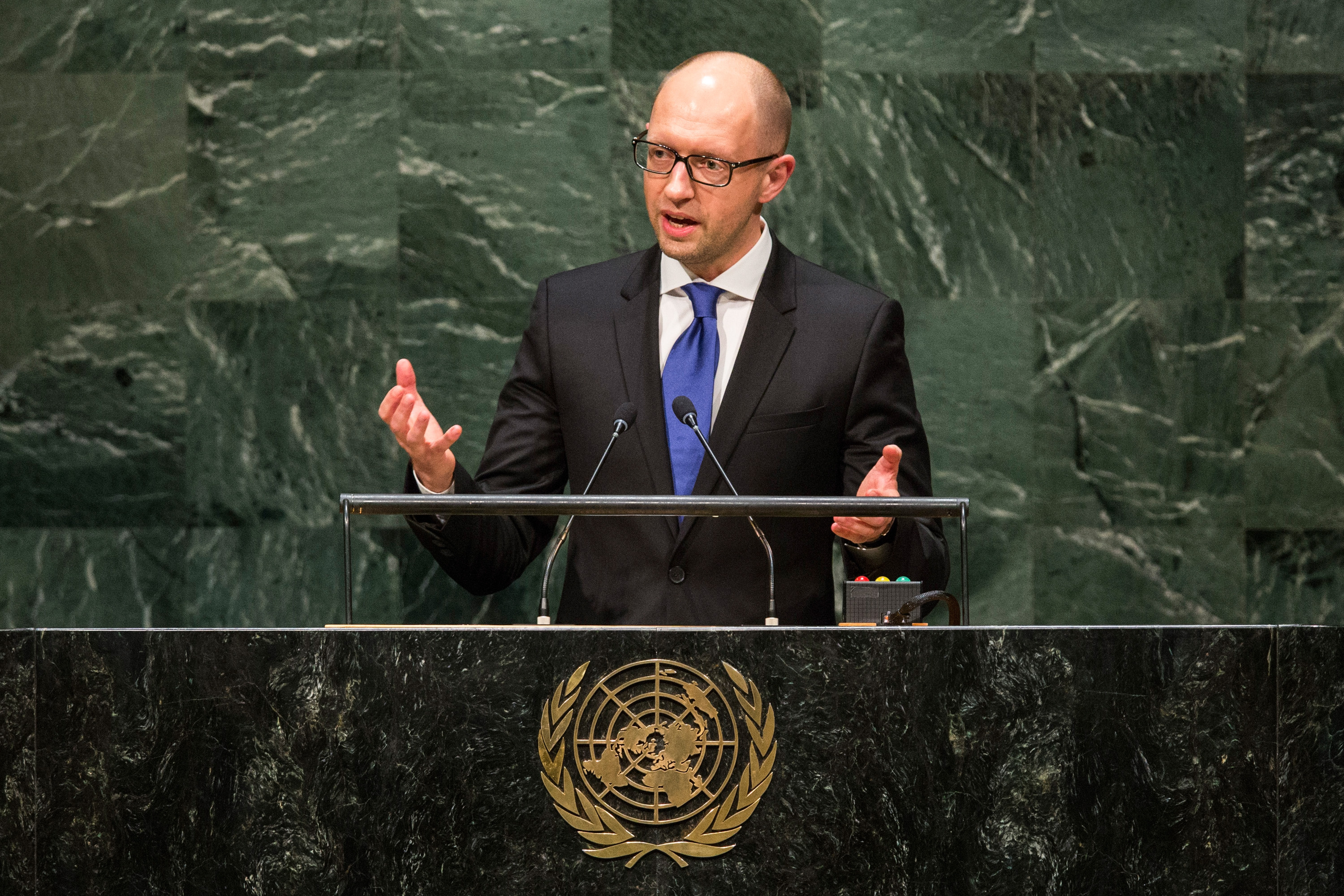 Свою небольшую речь на заседании Генеральной Ассамблеи ООН Арсений Яценюк посвятил российскому вмешательству в дела Украины. В основе конфликта лежит вторжение России на украинскую территорию, российские войска, заявил он, находятся на востоке Украины. Россия, по его словам, должна вывести из этих районов свои силы, свою артиллерию, прекратить снабжение "террористов", восстановить контроль на украино-российской границе и начать реальные переговоры. Киев не верит Москве. И Яценюк представил санкции как инструмент убеждения России: "Мы воспринимаем эти санкции как путь к началу переговоров и к разработке мирного соглашения. Мы не верим словам. Мы верим делам". Заключительную фразу выступления премьер-министра Украины в ООН широко цитирует американская пресса: