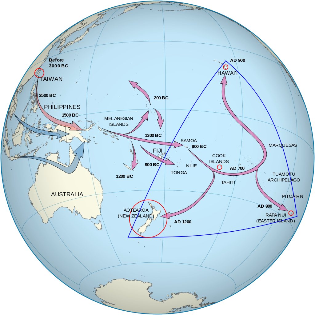 На протяжении столетий полинезийцы были активными мореплавателями. Они умело ориентировались по звездам, знали характер ветров и течений и совершали далекие рейсы между островами. Заселяя Тихий океан с востока, они к 800 – 700 годам до н.э. заняли архипелаги Тонга и Самоа, затем проникли в центральную Полинезию, где расположены острова Кука и Общества. Оттуда расселение шло по трем основным направлениям. Те полинезийцы, что отправились на север, достигли Гавайских островов. Восточный маршрут привел мореплавателей к архипелагам Туамоту, Тубуаи, Маркизским островам и далее к острову Пасхи. На юг отправились предки нынешних маори, которые достигли Новой Зеландии. Приблизительно к 1280 году был заселен весь «Полинезийский треугольник», заключенный между Новой Зеландией, островом Пасхи и Гавайями.