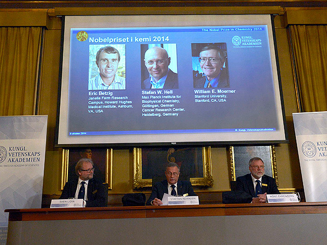 В среду, 8 октября, Нобелевский комитет Шведской королевской академии наук назвал имена победителей в области химии. Ими стали американцы Эрик Бетциг и Уильям Мернер и немец Штефан Хелль. Премии они удостоены за создание флуоресцентного микроскопа, позволившего сделать множество открытий в других областях науки, сообщает сайт Нобелевского фонда.