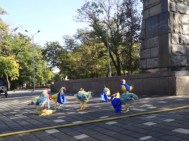 Жители Одессы, выступающие против проведения маршей памяти в честь воевавших в рядах Украинской повстанческой армии (УПА) солдат, провели своеобразный флешмоб. Активисты устроили "альтернативный марш" с участием петухов и кур, раскрашенных в желто-голубые цвета, сообщает портал "Таймер".