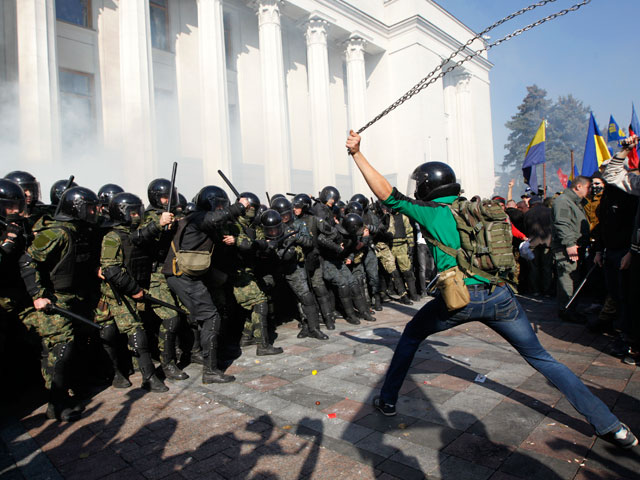 По данным ТАСС, около 200 человек под знаменами националистической партии "Свобода" начали забрасывать парламент и стражей порядка дымовыми шашками и взрывпакетами. Они также устроили драку с милицией и разбили окно в здании парламента. В свою очередь в пресс-службе ГУ МВД Украины в Киеве "Интерфаксу" сообщили, что около здания Рады находятся около восьми тысяч человек, причем принадлежат они к различным политическим силам и организациям.