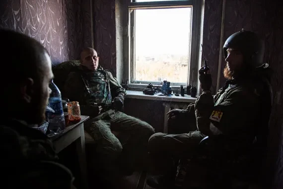 Гиви курит в маленькой кухне на седьмом этаже. Без брони, в обычной униформе с кружкой чая. На вид ему лет 35, высокий и смуглый. Перед окном с выбитой рамой сидят еще двое бойцов помоложе. На подоконнике шипят штук семь раций. Но никто не отвечает. В соседней комнате в бинокль смотрит девушка с шевроном «Отряд Гиви». В метрах восьмистах — здание нового терминала и его раскуроченные стены. В квартире этой — что-то вроде смотровой площадки.
