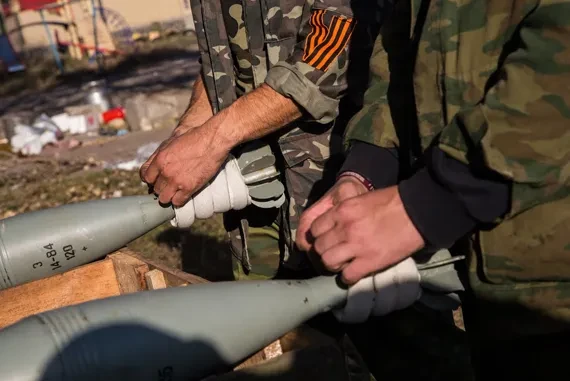 Пока тихо, во дворе 9-этажки снова начинается движение. Женщины выходят из подъезда посмотреть, куда упали снаряды. Из-под остова сгоревшей когда-то давно «Газели» вылезают кошки. Откуда-то возникает брошенный ретривер, исхудалый и с грязным ошейником. Минометчики начинают переносить ящики с боеприпасами — из-за дома поближе к орудию. Мы делаем несколько кадров, а дэнээровец Вова мчится докладывать Гиви. Идем к Гиви следом. «Сфотографировали мины с российской маркировкой!» — говорит, запыхавшись, Вова. «Ничего российского у нас тут нет, — отвечает Гиви уверенно. — Все это — отжатое у укропов».