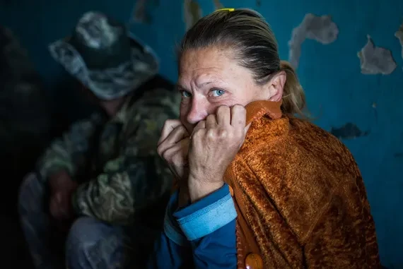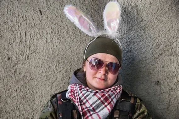 Мимо нас снова пробегает минометчик Вова: «Щас заправим укропов сто двадцатыми!» В подъезд снова набиваются люди. Среди нас, гражданских, оказываются два молодых пулеметчика. «Они очумели, — говорит пулеметчик с усами и запачканным лбом. — У них ящики с боекомплектами прямо под обстрелом». Кошки и брошенный ретривер, замечая суету возле миномета, бегут в подвал. Женщины в подъезде закрывают ладонями уши — миномет начинает гулко бить. Ответ прилетает очень скоро. Первые снаряды ложатся вдалеке, затем все ближе и наконец попадают уже в дом. Женщины садятся на скамейку. Сыплется что-то сверху. Через выломанную дверь подъезда видно, как летят стекла и осколки ложатся на асфальт. Минометчики садятся на корточки.