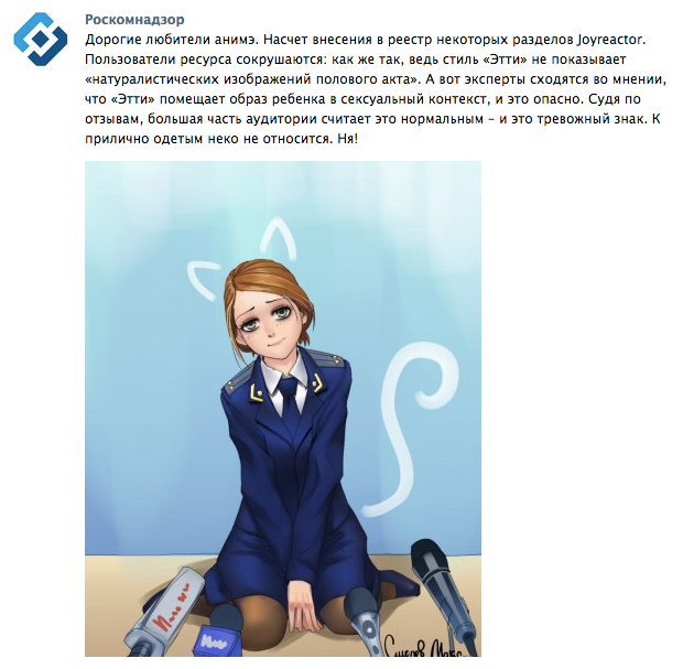 Роскомнадзор, занимающийся блокировками сайтов и контролем деятельности СМИ, завел страницу в соцсети «ВКонтакте». Стиль паблика — неформальный: ведомство называет себя «РосКотНадзором» и уведомляет подписчиков, что «прилично одетых неко» (героинь аниме) запрещать не будет. Пользователи «ВКонтакте» в ответ называют ведомство «РосСкотНадзором» и возмущаются разговорными оборотами в постах и комментариях.