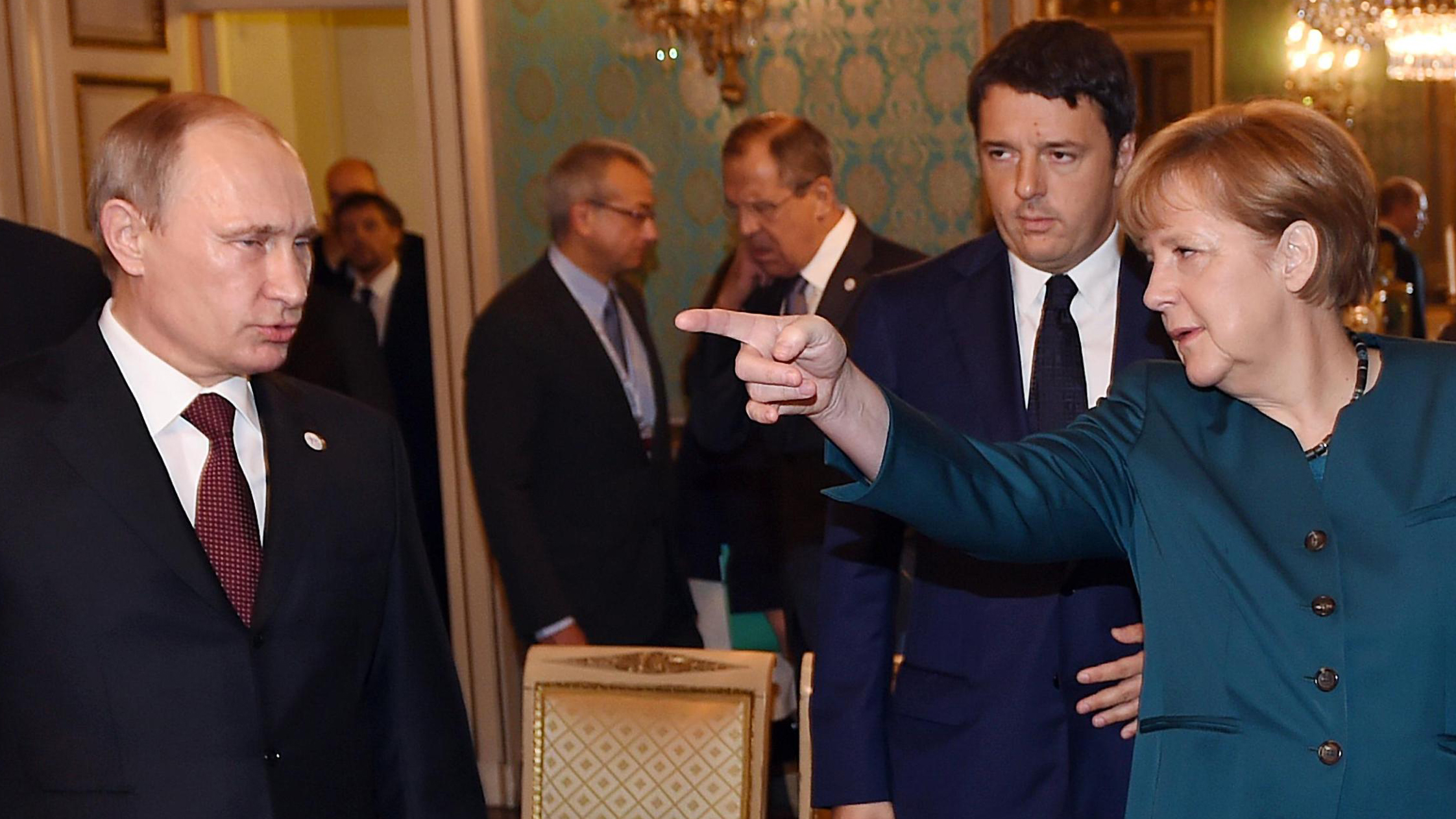 Поздно вечером в четверг канцлер Германии Ангела Меркель встретилась и с президентом России Владимиром Путиным, причем их переговоры практически были на грани отмены из-за опоздания Владимира Путина с прилетом в Италию из Сербии. Основной темой встречи, как заявил по ее итогам Дмитрий Песков, стало "завершение процесса разведения противоборствующих сторон на юго-востоке Украины". При этом он признал, что Меркель и Путин по-прежнему не сходятся во взглядах на причины конфликта на Украине.