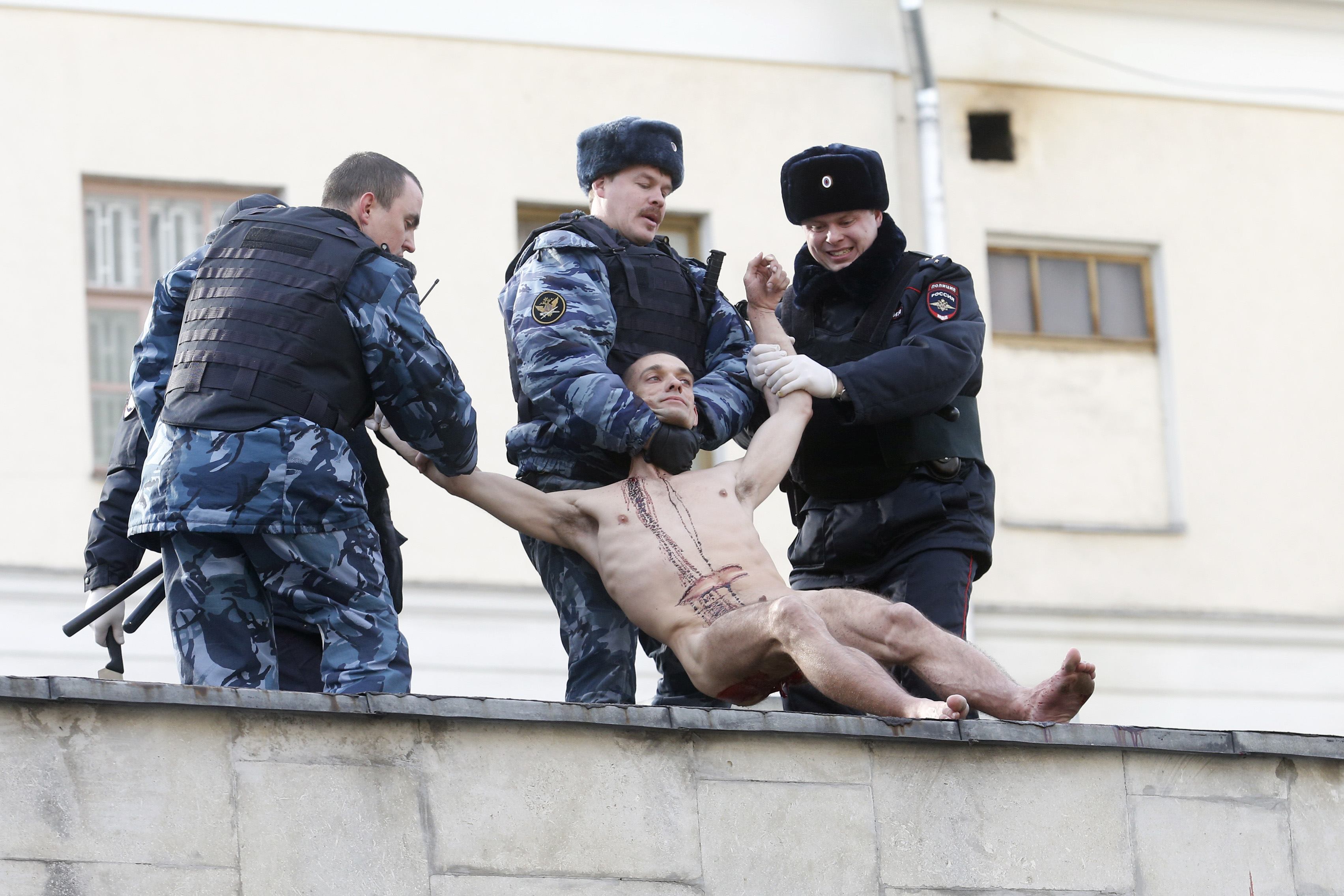 – Гораздо больше – порядка двух часов. Там собралось очень много представителей власти, различных структур, психиатров, полиции, сотрудников МЧС. Они не знали, что им делать, потому что я ничего не требовал, никаким образом им не угрожал, но они боялись. Они боялись человека вроде бы беззащитного, без одежды, хотя все были вооружены, у них бронежилеты, огнестрельное оружие, все необходимое для защиты. А у меня только тело, нож и отделенная мочка. Они очень долго разрабатывали стратегию, каким образом меня захватывать, им понадобилось два часа. И как раз эти два часа длились постоянные провокации, подкладывание матов мягких, предложение слезть добровольно – это был момент, который необходимо было выдержать. Потому что если в этот момент не выдержать и сломаться, тогда ты, получается, сам сломал свою акцию. Если ты уже вышел на эту линию, нужно держаться до конца.