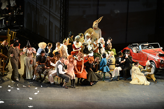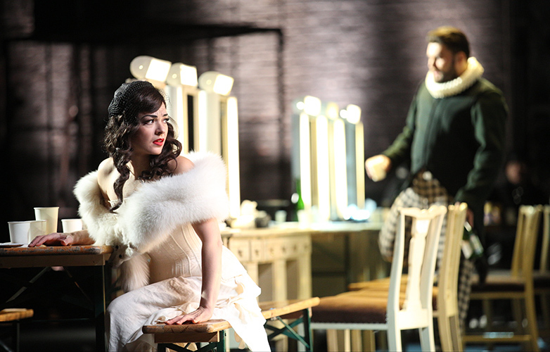Шокирующе-простодушную историю безгрешной развратницы Манон, написанную аббатом Прево в середине XVIII века и сильно мелодраматизированную Пуччини в конце XIX, постановщики перенесли в золотой век кинематографа, с которым, как выяснилось, отлично уживаются и приторность страстей, и будуарная ароматность партитуры. Первая же сцена на «фабрике грез», где начинающая актрисулька Манон оказывается перед выбором между любовью к молодому лузеру с шутовским жабо на шее (привет еще одному памятнику эпохи итальянского оперного веризма — «Паяцам» Леонкавалло) и успехом, который возможен только в объятиях престарелого продюсера, поражает идеальным слиянием картинки и саундтрека. Красивый киношный полумрак (художник по свету Олаф Фриз), остроумные придурочные костюмы (Урсула Кудрна), красный кабриолет из времен Великого Гэтсби в качестве центральной детали сценографии, элегантно оголенная коробка сцены, имитирующая голливудский павильон, — суматошная жизнь на съемочной площадке отлично попадает в такт музыке.