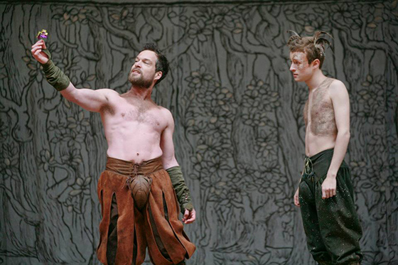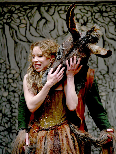 Волшебный лес в этом «Сне» оказывается языческими кельтскими дебрями: никаких мотыльковых эльфов и малюток-фей — только рогатые и пернатые существа в звериных масках, облаченные в кожу и мех. Король Оберон (Аден Джиллетт), конечно, неутомимый охотник, но и решительная Титания (Джейни Ди), знаете ли, далеко не бабочка. Немного дионисийства еще ни одному театру не повредило. Превратившийся в осла Основа (Тревор Фокс) идеально вписывается в эту дикарскую компанию. Став парнокопытным, он не утратил страсти к преувеличенной жестикуляции самодеятельного Актера Актерыча, но самым смешным его трюком, пожалуй, остался кроткий жест, когда Основа понимающе сдвинул длинные ослиные ушки, чтобы они как-то пролезли в венок, которым венчали его голову. Вот эти неожиданные тонкости в нарочито грубоватом спектакле, вероятно, смешат более всего.