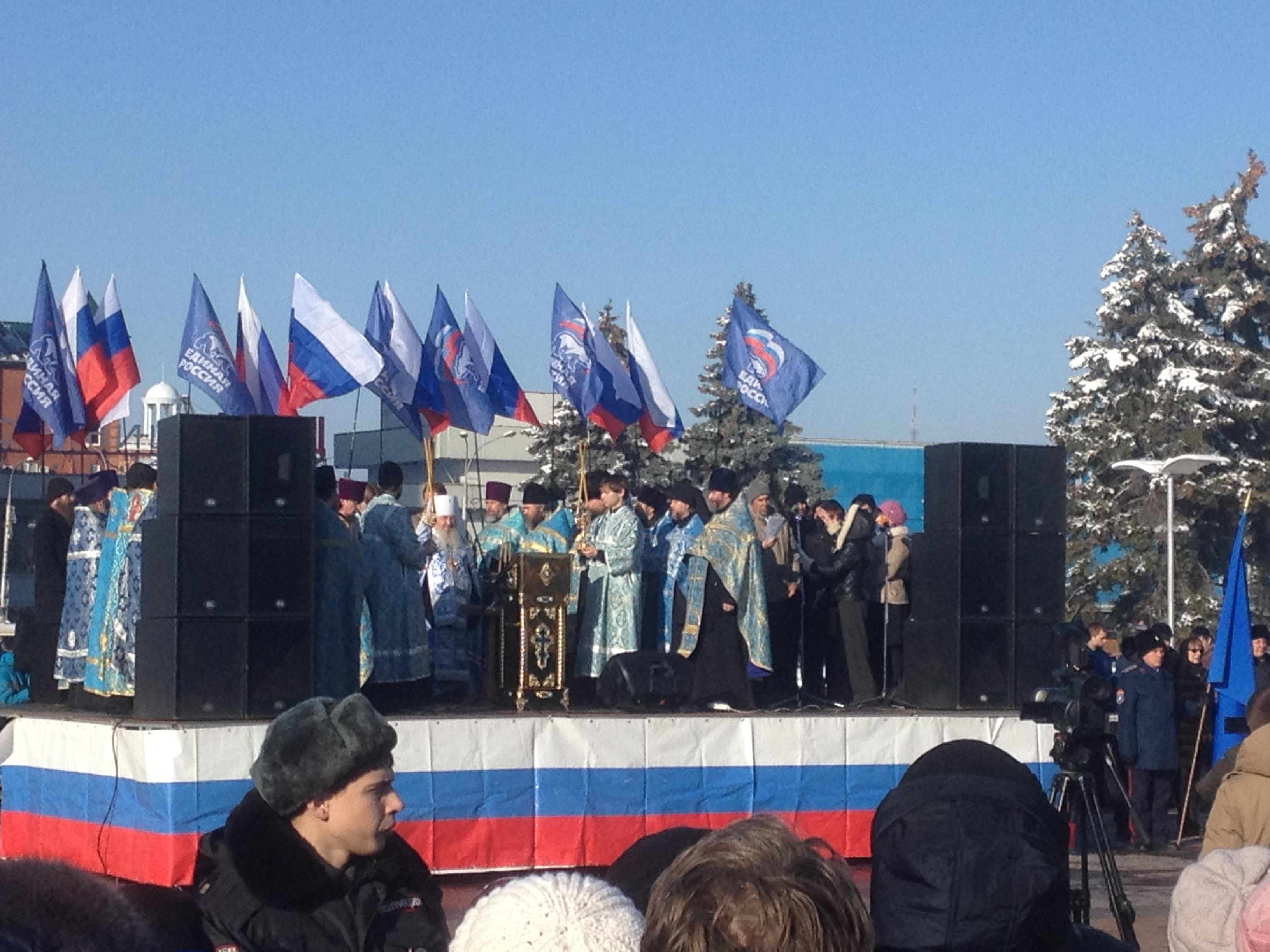 Любопытно, что трибуну на сей раз разместили не под рельефным изображением Ленина на здании Мемориального центра, как обычно, а несколько в стороне, так что участники молебна крестились не на Ленина, а на гостиницу "Венец", на флаги "Единой России" и на историка Карамзина, изображенного на баннере.