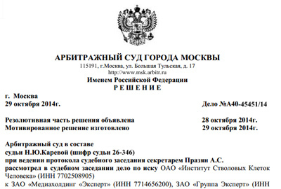 Арбитражный суд Москвы взыскал с журнала «Русский репортер» и медиахолдинга «Эксперт» 46,5 млн рублей возмещения вреда деловой репутации Института стволовых клеток человека (ИСКЧ). Это самая большая сумма компенсации в истории российских СМИ.