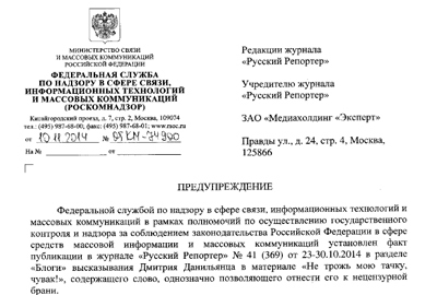 В предупреждении, скан которого размещен на сайте Роскомнадзора, говорится, что в статье содержится слово, «однозначно позволяющее отнести его к нецензурной брани».