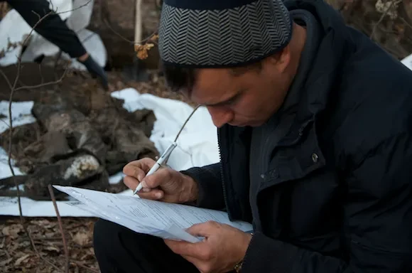 Эксгумация. Толя оформляет документы, описывая все отличительные признаки, которые могут помочь в опознании останков