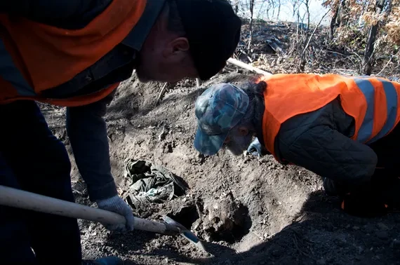 В десяти метрах от дороги среди деревьев виднеется едва заметный холмик. Несколько энергичных уверенных движений лопатой — ребята снимают первые десять сантиметров грунта. Тела часто даже не закапывают, а присыпают, поэтому дальше поисковики работают медленно и осторожно. Через пару минут на поверхности показывается кусок ткани, в котором угадывается камуфляж.