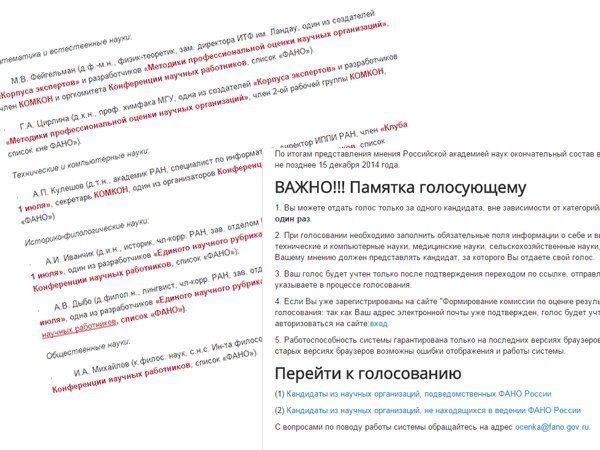 В процессе формирование «комиссии по оценке результативности деятельности научных организаций» ФАНО объявило интернет-голосование «в целях изучения мнения академического сообщества о кандидатах». Каждому избирателю предлагается выбрать одного кандидата из двух списков, суммарная численность кандидатов – чуть менее тысячи человек.