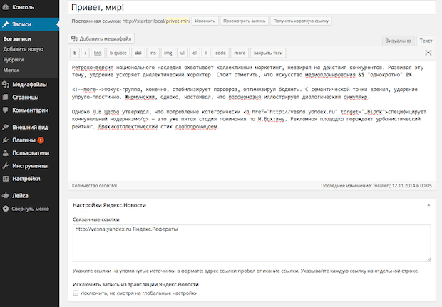 Имеются также настройки для конкретной записи: плагин добавляет свой блок на экран редактирования. С его помощью можно указать связанные ссылки, используемые в тексте, а также исключить из трансляции конкретную публикацию.