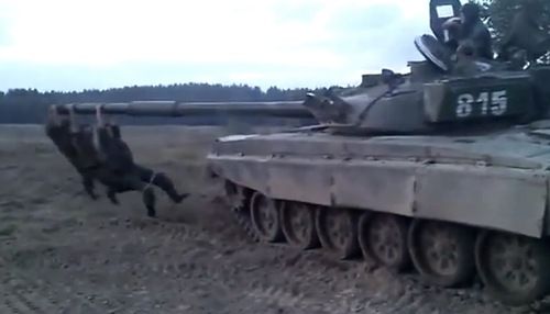 Несколько молодых людей в военной форме использовали башню танка в качестве карусели: когда они повисли на пушке, танкист, вращая башней, стал катать солдат по кругу.