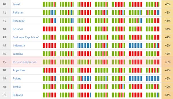 «Индекс открытых данных» 2014 Фото: okfn.org Фонд открытых знаний (Open Knowledge, OKF) опубликовал рейтинг территорий по открытости государственных данных за 2014 г. Hейтинг называется «Индекс открытых данных» (Open Data Index). В него в этом году вошло 97 территорий. В основном это государства, но туда также включались и территории, заявляющие о своей независимости, но официально таковыми не признанные. Индекс публикуется уже второй раз (впервые он был составлен в 2013 г., и туда вошло 60 территорий). Первое и второе места в Индексе получили, как и в прошлом году, Великобритания и Дания соответственно. Последние позиции достались Гаити, Мали и Гвинее. Россия с 33-й позиции в 2013 г. переместилась на 45-ю в 2014 г., сохранив при этом неизменным общий балл по открытости данных – 43%.