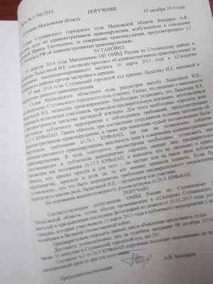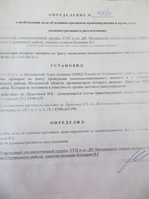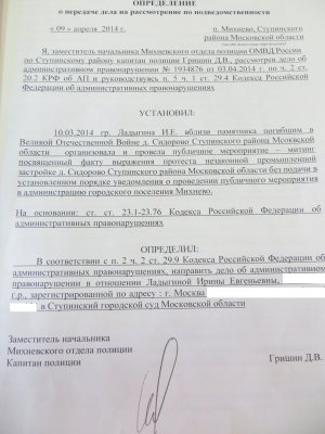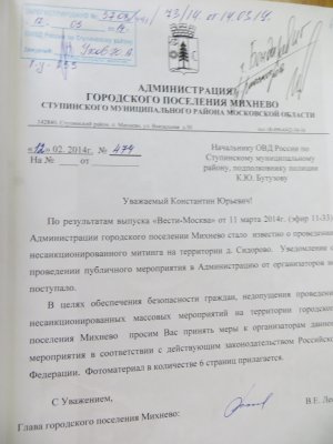 Однако «фашистско-украинская» тема в связи с митингом 2 марта нашла отражение не только в газете. 3 апреля, как рассказывает Ладыгина, она обнаружила, что в Михневе и находящемся неподалеку селе Семеновском распространяют листовки под лозунгом «Фашизм не пройдет», в которых упоминался тот же митинг, иллюстрировавшийся все той же фотографией с плакатом в поддержку Украины и Майдана. Ладыгина отметила, что листовки были хорошего качества, явно напечатаны типографским способом. В листовках содержались нападки на местного муниципального депутата Сергея Снастина, который в то время поддерживал жителей Сидорова (о нем без упоминания фамилии говорилось и в статье Вагина-старшего). Ладыгина отправилась в Михневский отдел полиции, чтобы написать заявление о распространении клеветнической информации в отношении Снастина. Там ей заявили, что хотят ее допросить по поводу некоего незаконного митинга, который она организовала (речь явно шла не о митинге 2 марта, поскольку он был согласован с администрацией). Ладыгина ответила, что не понимает, о чем речь, сослалась на усталость и добавила, что если есть необходимость ее допросить, то пусть присылают ей повестку. Вместо этого, когда она уже собиралась уходить из отдела, ее пригласили в кабинет якобы для разговора с начальником, однако туда вошли двое капитанов полиции (один из них — знакомый ей деревенский участковый) с какими-то двумя женщинами — из того, что говорили полицейские, Ладыгина не поняла, понятые это или свидетели, — и начали в резкой форме задавать ей вопросы про некий незаконный митинг. Ладыгина продолжала настаивать на соблюдении формы, требовала, чтобы ей прислали повестку. Когда она попыталась выйти из кабинета, участковый начал ее отталкивать. Ладыгиной стало плохо, поднялось давление, ей вызвали «скорую». По ее словам, пока прибывший врач делал ей уколы, она видела, как одна из то ли понятых, то ли свидетелей свободно заходила к полицейским в дежурную часть и спрашивала: «Где мои вещи, ребята?» Меньше чем через неделю Ладыгина попала в больницу из-за сильных скачков давления. Только позднее, когда Ладыгину вызвали в суд, она выяснила, что на нее заведено административное дело по статье 20.2 как организатора некоего несанкционированного митинга, который якобы состоялся 10 марта.
